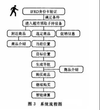 整個(gè)智能超市系統(tǒng)由身份識(shí)別、搜索導(dǎo)航、信息讀取、廣告推送、智能清算5部分組成。