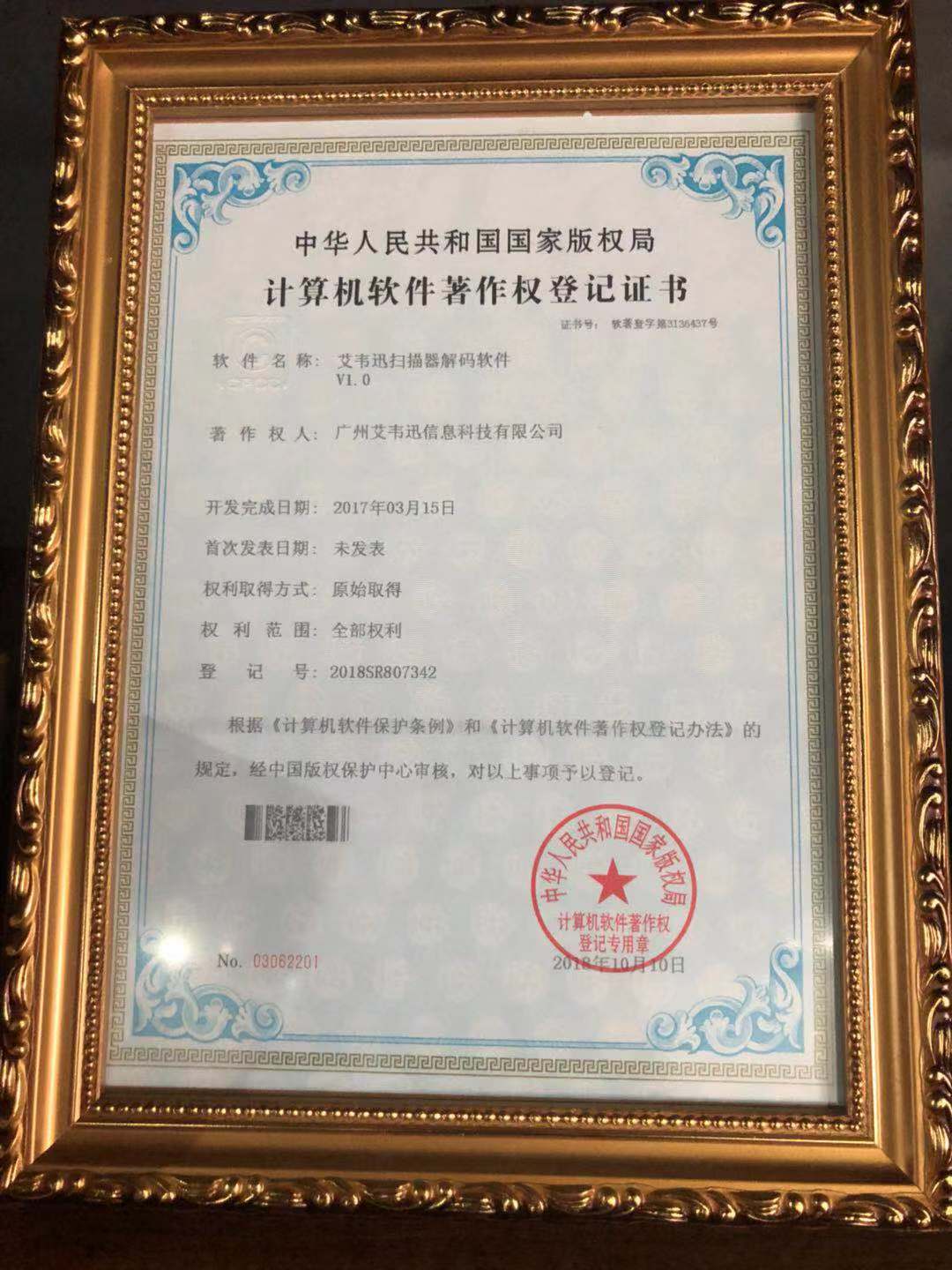 熱烈祝賀艾韋迅科技獲得《艾韋迅掃描器解碼軟件V1.0》的軟件著作權證書。艾韋迅堅持自主創(chuàng)新研發(fā),在條碼解碼領域堅持自己獨特的研發(fā)優(yōu)勢。先后為客戶提供倉庫分揀掃碼、產線計件掃碼、質量追溯掃碼等創(chuàng)新技術服務。在長期技術研發(fā)和創(chuàng)新中,形成了擁有完全自主知識產權的新型條碼、二維碼解碼解決方案。《艾韋迅掃描器解碼軟件V1.0》軟件著作權證書的獲得,證明我們的在條碼物聯(lián)網(wǎng)應用領域的技術實力和研發(fā)精神。